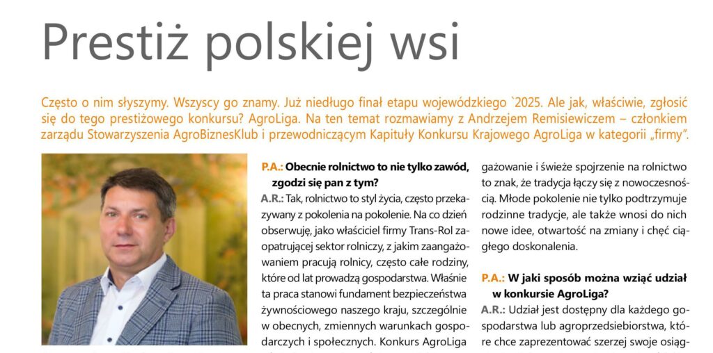 Z przyjemnością informujemy o ukazaniu się w sierpniowym numerze miesięcznika Podlaskie Agro wyjątkowej rozmowy z właścicielem firmy TRANS-ROL Panem Andrzejem Remisiewiczem, w której dzieli się swoimi doświadczeniami i refleksjami na temat prestiżowego Konkursu AgroLiga. Polecamy lekturę.